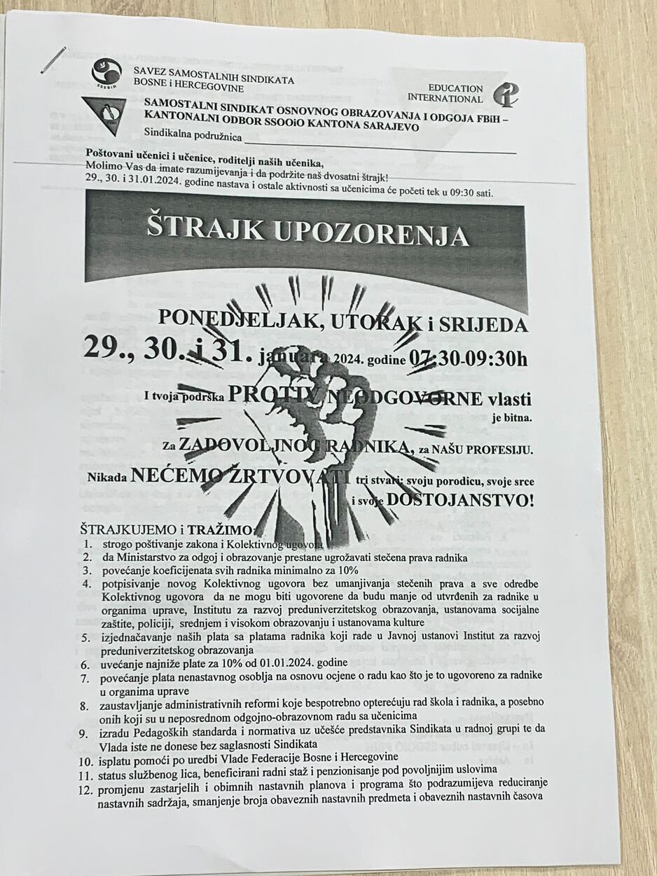 “Zbog toga idemo u štrajk upozorenja. Mi smo kazali da se u periodu važenja kolektivnog ugovora moraju se uskladiti plate u školama i vrtićima sa platama au ostalim sektorima i to nije urađeno. Zbog toga tražimo da vlada to uradi. Radnicima sa najnižim platama se mora utvrditi uvećanje plate od 10 posto kao u organima uprave. Vlada krši kolektivni ugovor već mjesec dana i to je razlog za štrajk. Pregovara se sa sindikatom srednjeg obrazovanja upravo sad koji traži povećanje od 10 posto, što i mi tražimo. Odustali smo od 15 posto koliko smo tražili prošle godine” rekao je Sivro.